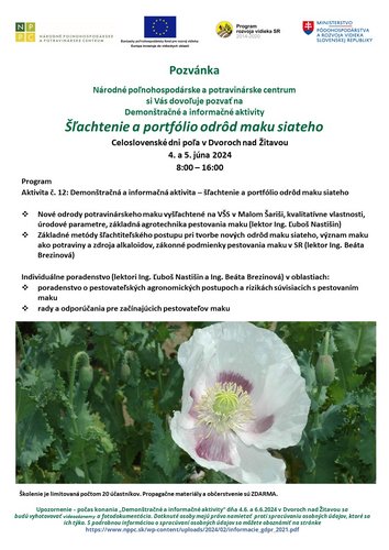 Národné poľnohospodárske a potravinárske centrum – Výskumný ústav rastlinnej výroby Piešťany Vás pozýva na Demonštračnú a informačnú aktivitu o šľachtení a portfólia odrôd maku siateho vyšľachtených na NPPC – VURV – Výskumno-šľachtiteľskej stanice Malý Šariš v rámci ktorej výskumný pracovníci budú prezentovať nové odrody potravinárskeho maku, kvalitatívne vlastnosti, agrotechnika pestovania maku, metódy šľachtiteľského postupu pri tvorbe nových odrôd maku siateho a individuálne poradenstvo.